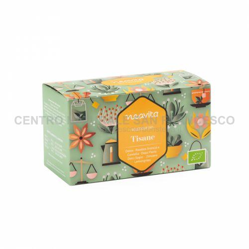 Confezione contenente 5 varietà di tisane contenenti ingredienti da agricoltura biologica indicate per diversi momenti della giornata: la tisana Detox contiene estratti di natura vegetale ideali per favorire le funzioni depurative dell'organismo e sostenere l'attività epatica; la tisana Rooibos, arancia e cannella, senza caffeina, rappresenta un'ottima fonte di antiossidanti, facilita la digestione e dona vitalità se consumato durante la colazione; la tisana Dolci sogni è utile per favorire il sonno e il rilassamento; la tisana Dopo pasto contiene estratti vegetali ideali per favorire la digestione ed eliminare il gonfiore addominale; la tisana Zenzero e lemongrass è composta da ingredienti dall'aroma pungente e agrumato, ideali per riportarci ad un mondo caldo ed esotico. I filtri sono in carta non trattata, non sbiancanta e privi di punti metallici